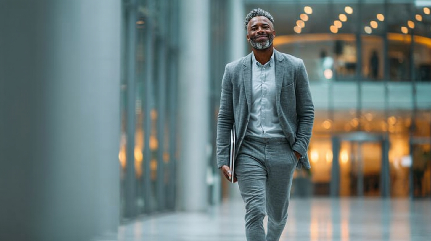A businessman in a suit walking through a modern office holding a laptop, professionalism, confidence, motion blur, contemporary interior, sleek design, positive mood, dynamic composition, natural daylight illumination, –no text::5 –ar 16:9 –q 2 –s 750