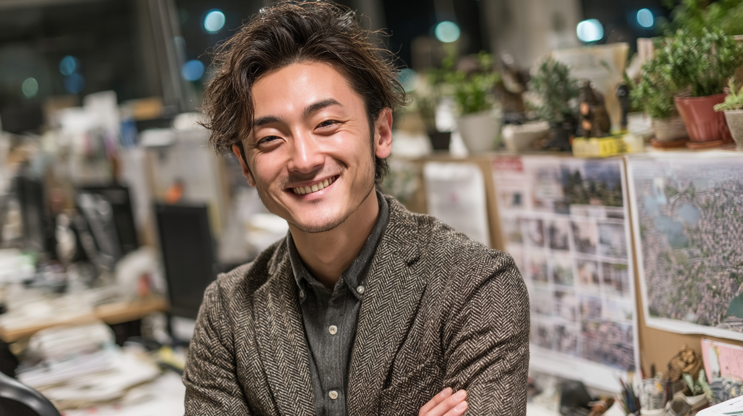 A Japanese businessman in his 20s in a modern office environment, clean and stylish suit, youthful and energetic appearance, confident yet approachable posture, realistic facial features, professional atmosphere, positive and ambitious mood, waist-up portrait composition, soft natural office lighting, –no text::5 –ar 16:9 –q 2 –s 750