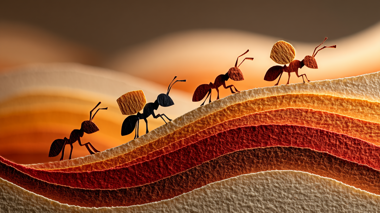 A paper-cut style picture book illustration of hardworking ants, ants carrying food and working together, layered cut-paper shapes, handcrafted paper textures, simplified silhouettes, warm earthy color palette, diligent and wholesome mood, horizontal composition showing coordinated movement, soft ambient lighting with gentle paper shadows, –no text::5 –ar 16:9 –q 2 –s 750